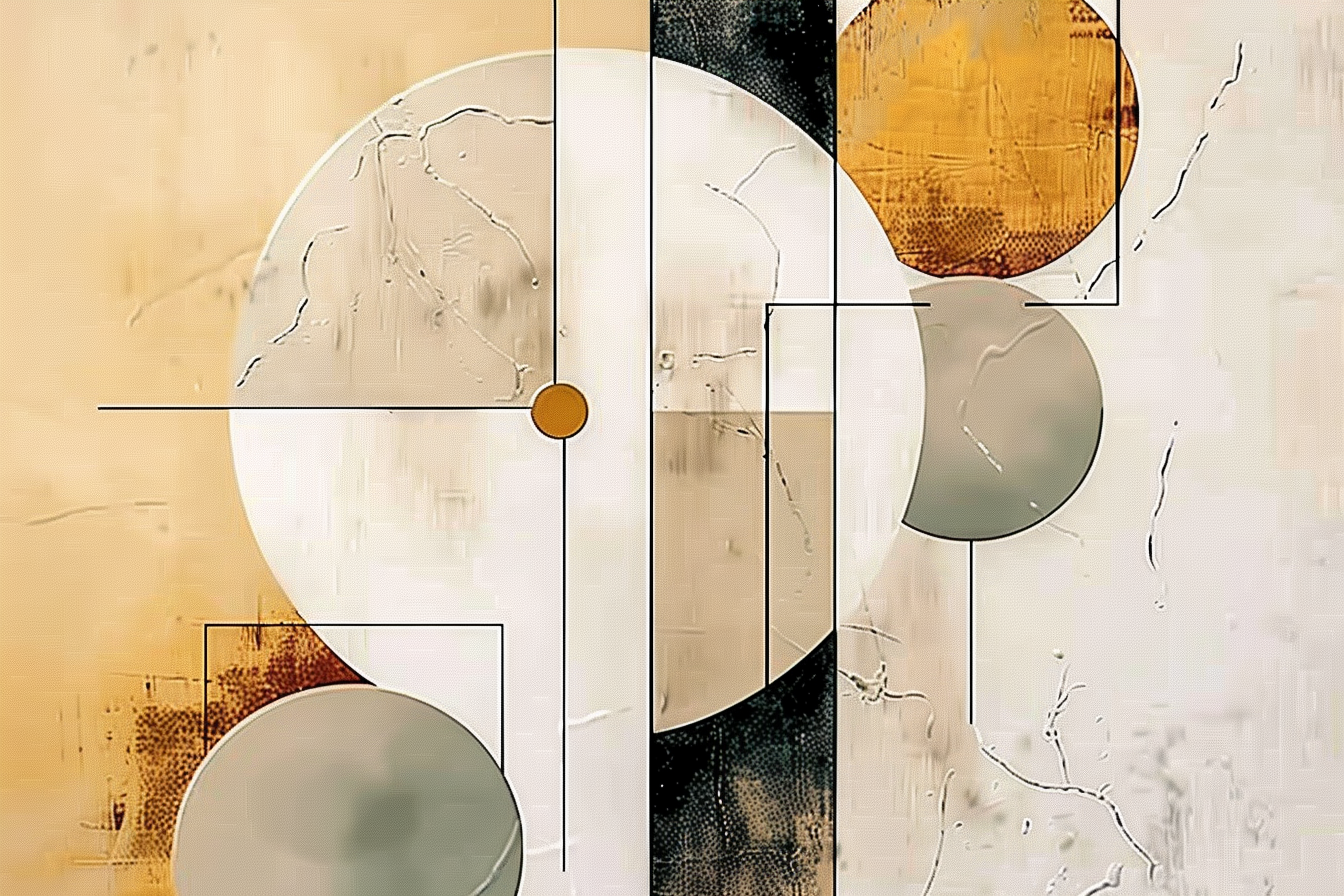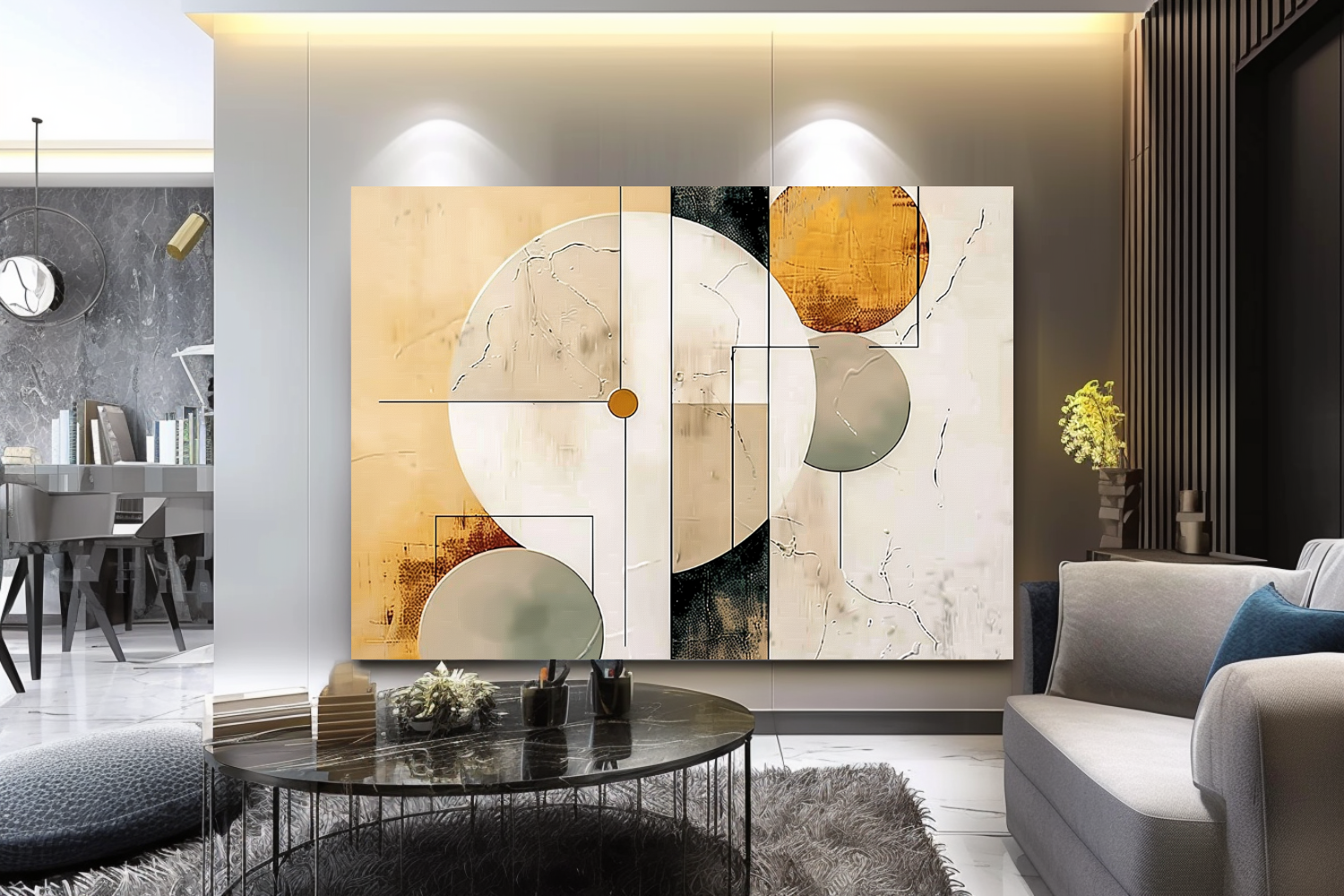 This painting showcases various circles of different sizes and colors, elegantly arranged on a neutral background. Featuring light beige, yellowish, gray, and white tones, it incorporates delicate black linear details and touches of gold, adding a sense of sophistication and uniqueness. The circles and lines form a harmonious and balanced composition, inviting the viewer to explore the interaction between shapes and colors. Every element is thoughtfully placed, emphasizing order and aesthetic beauty.