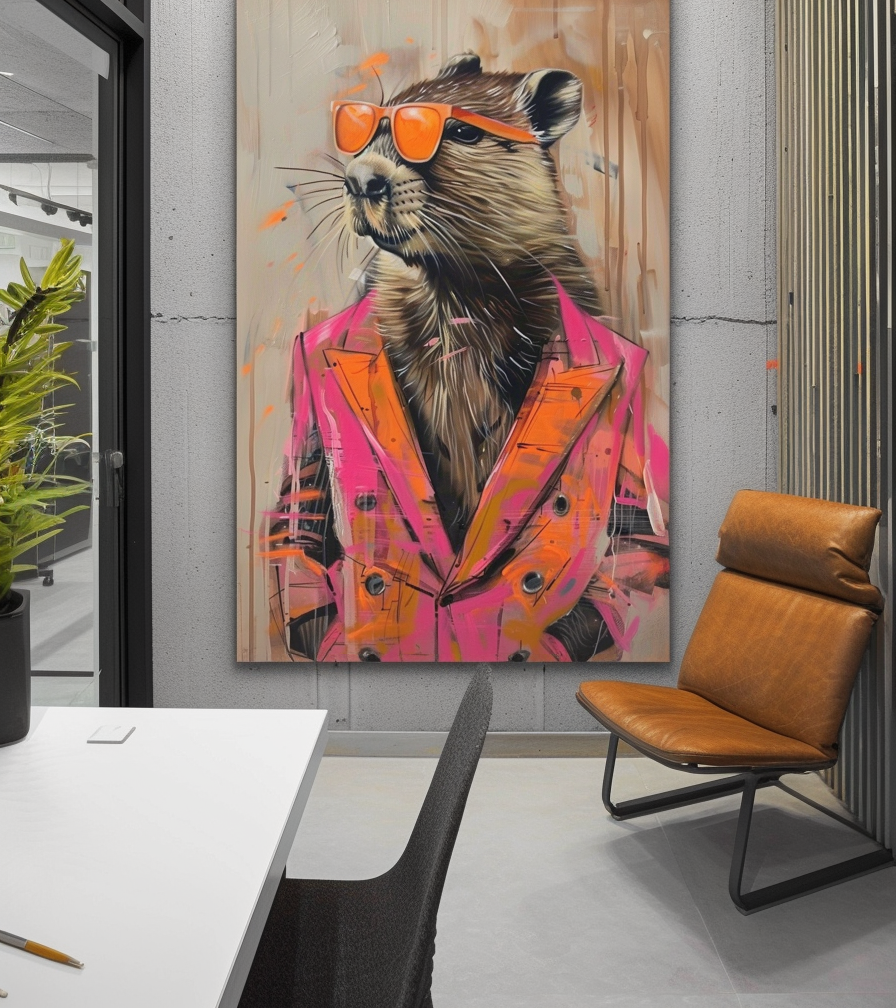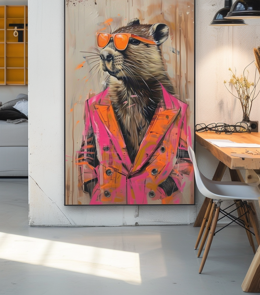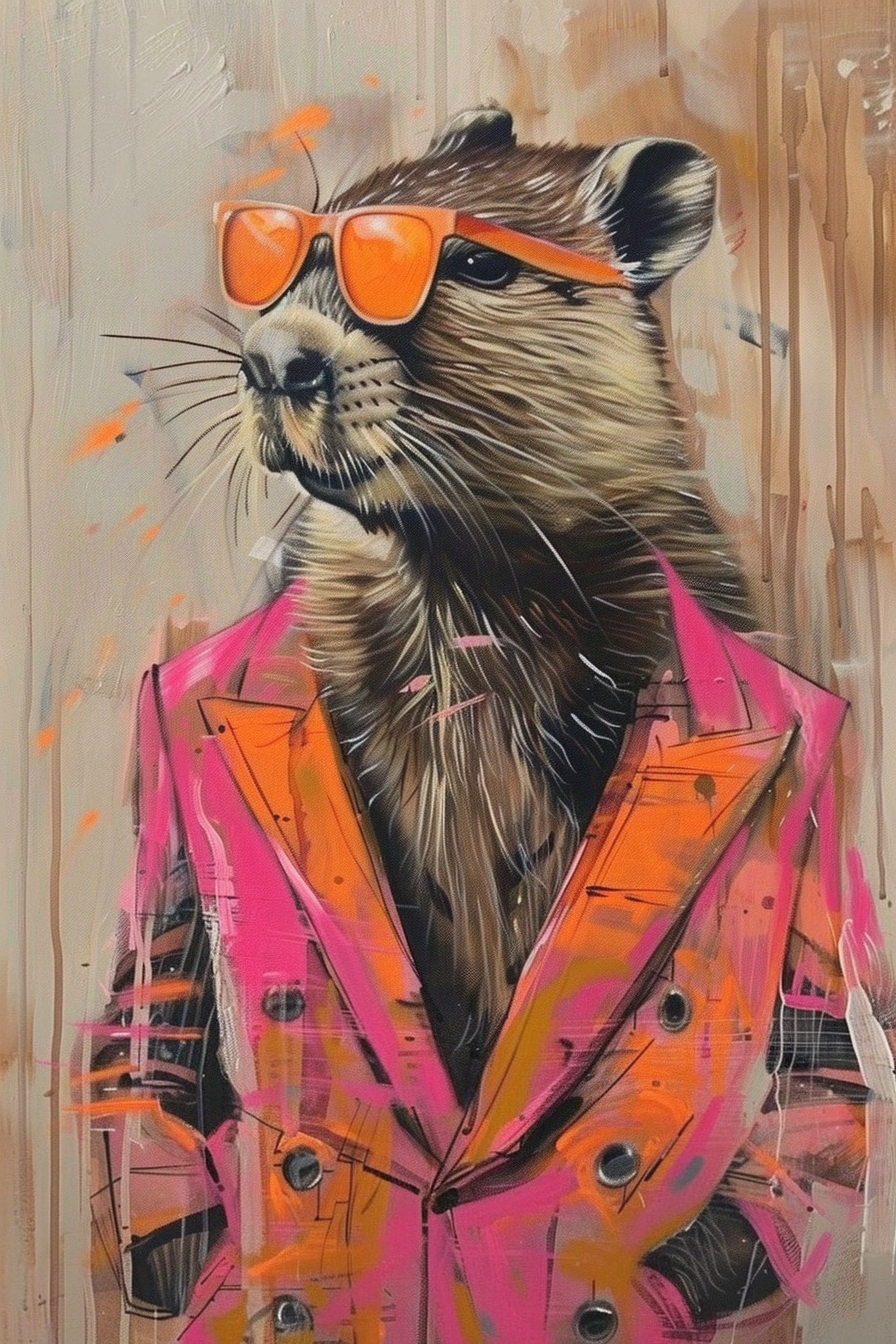 This painting stands out with its unique charm and humor, telling a playful story of the intersection between the animal and human worlds. The beaver’s expression, self-assured gaze, and stylish attire suggest that style is a universal language, unbounded by origin or circumstances.