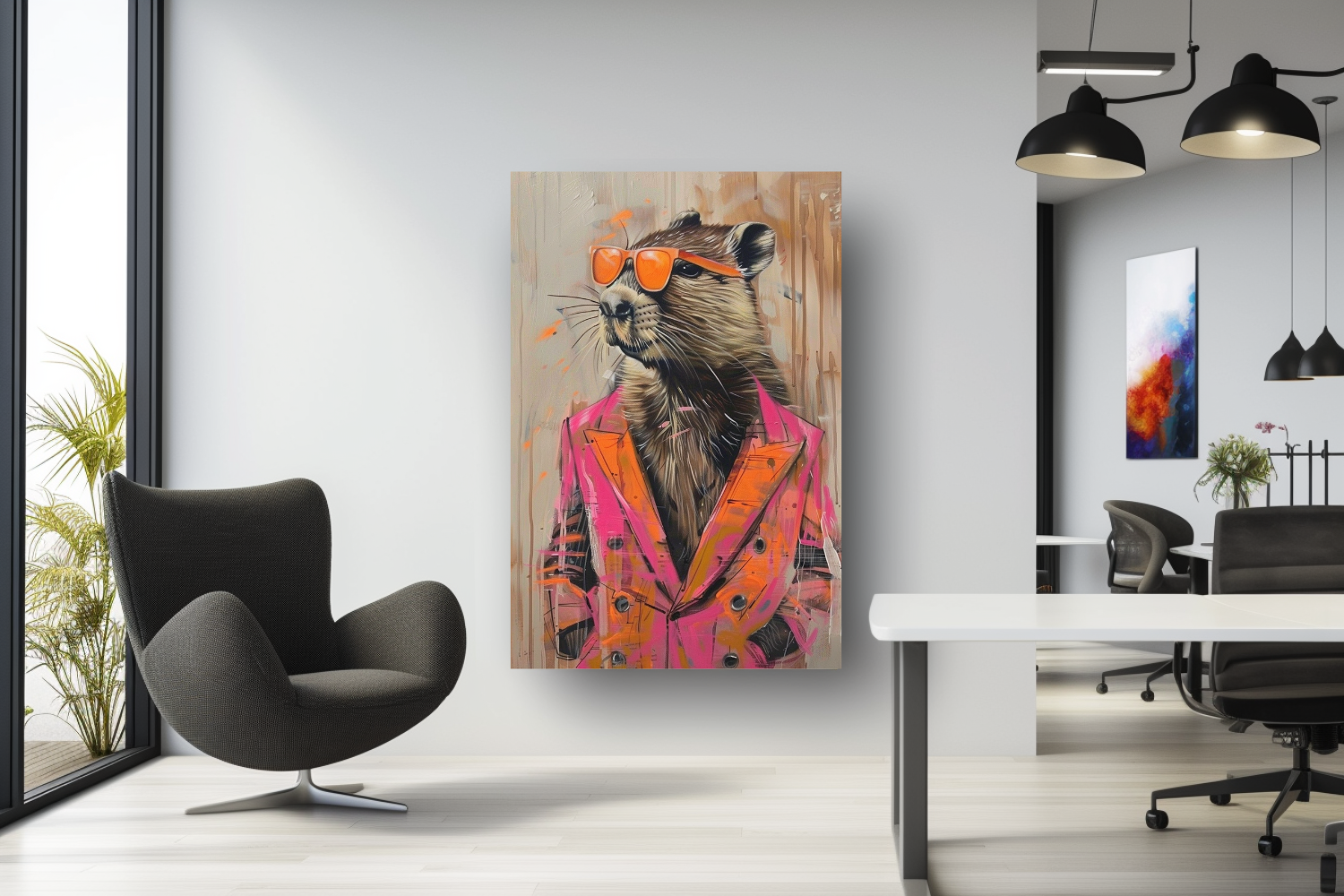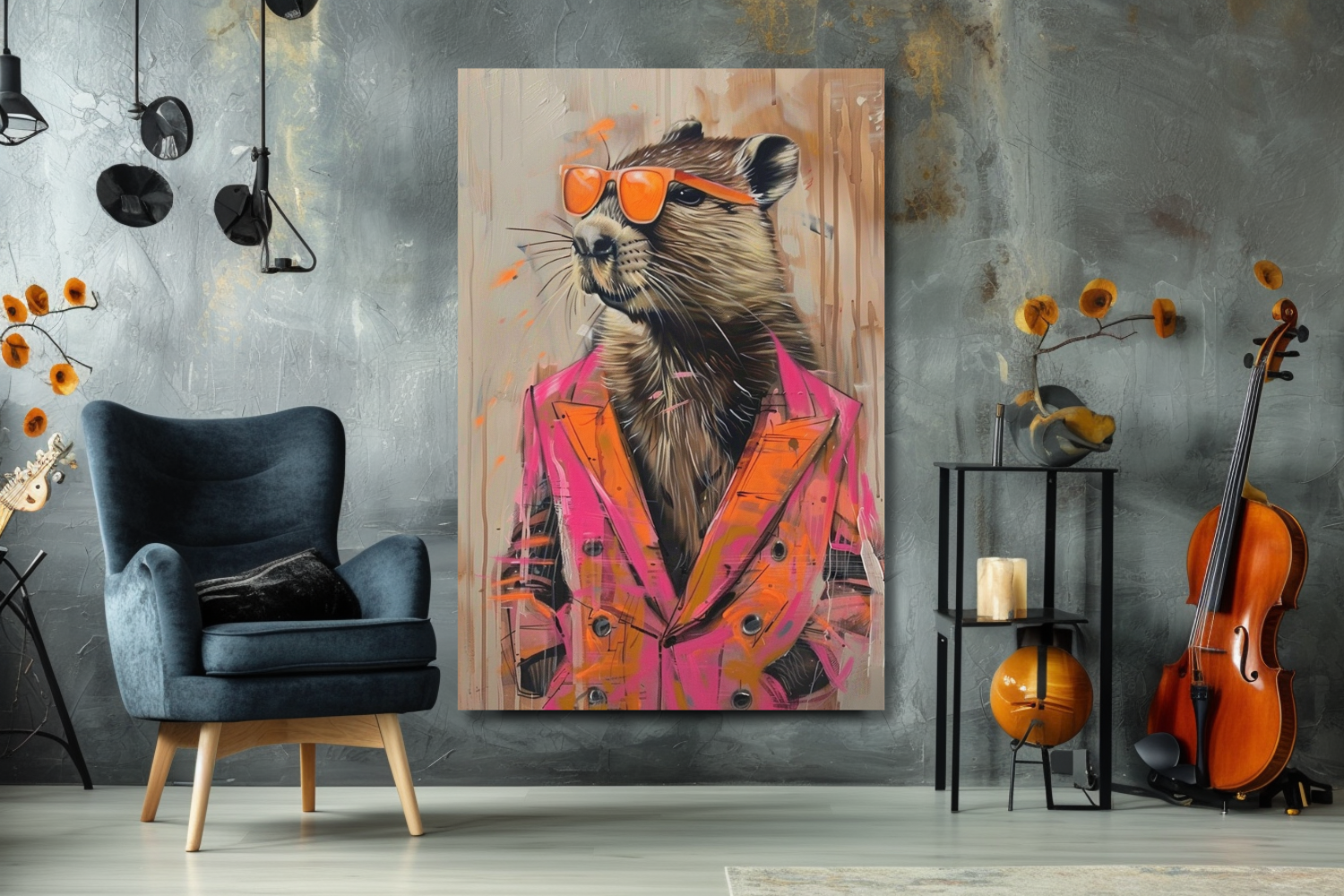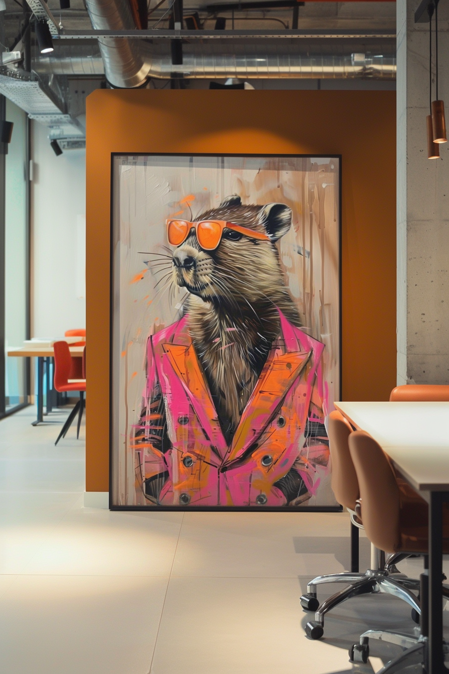 This painting stands out with its unique charm and humor, telling a playful story of the intersection between the animal and human worlds. The beaver’s expression, self-assured gaze, and stylish attire suggest that style is a universal language, unbounded by origin or circumstances.