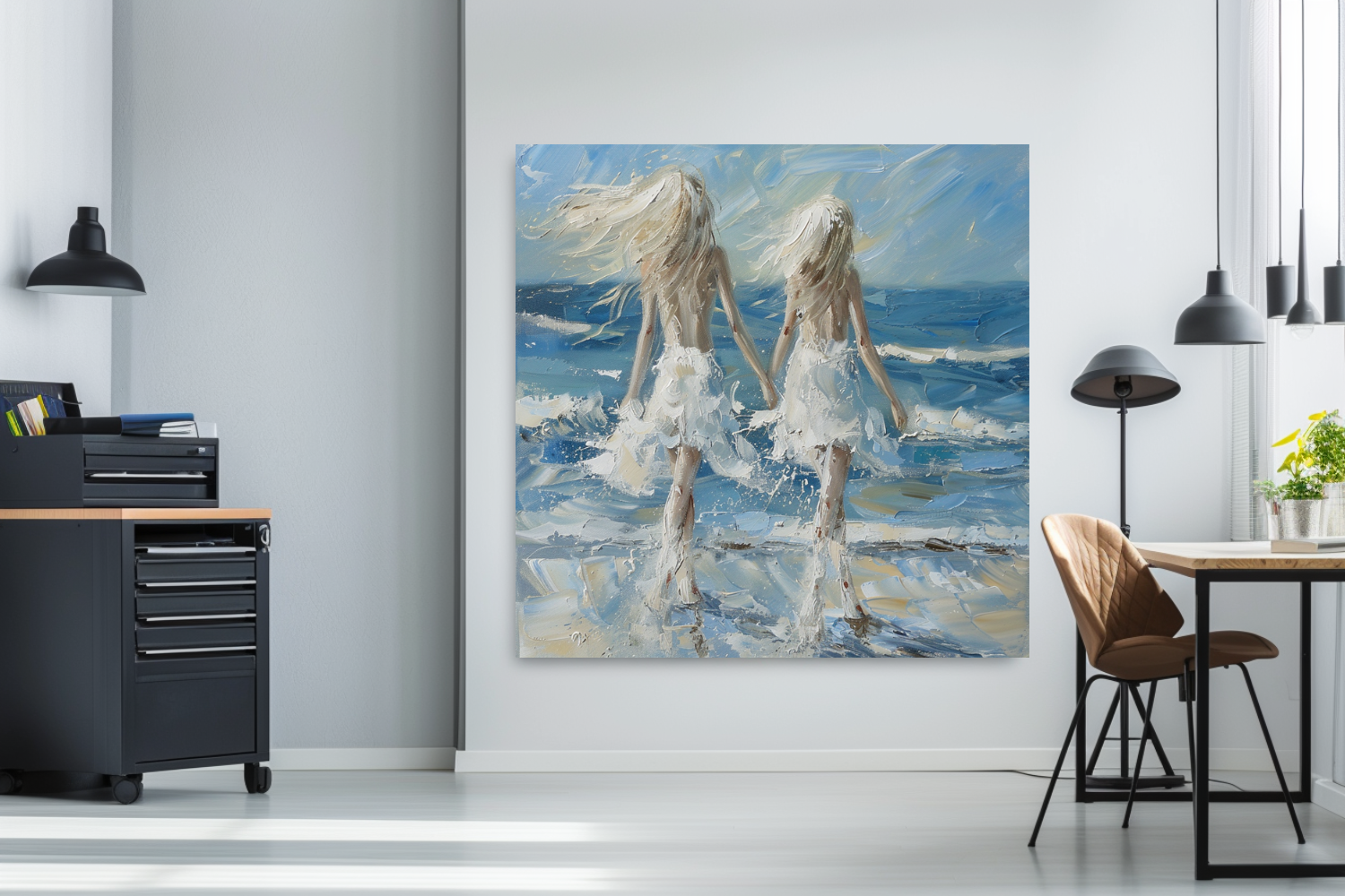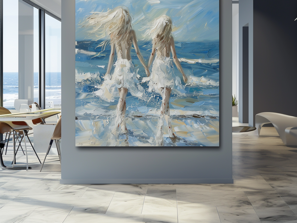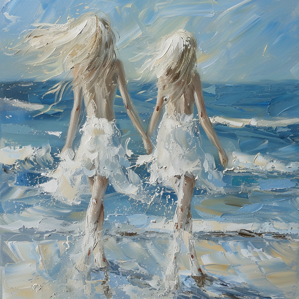 The painting “Sisters” depicts an idyllic scene where two young girls, dressed in white dresses, walk hand-in-hand along the seashore. These sisters share and experience every moment together. Gentle waves lap at their feet, and the wind playfully tosses their light hair. The serene sky, sun, and white-tipped waves create a soothing and relaxing background. The girls are portrayed as moving through life effortlessly and carefree, fully immersed in the present moment.