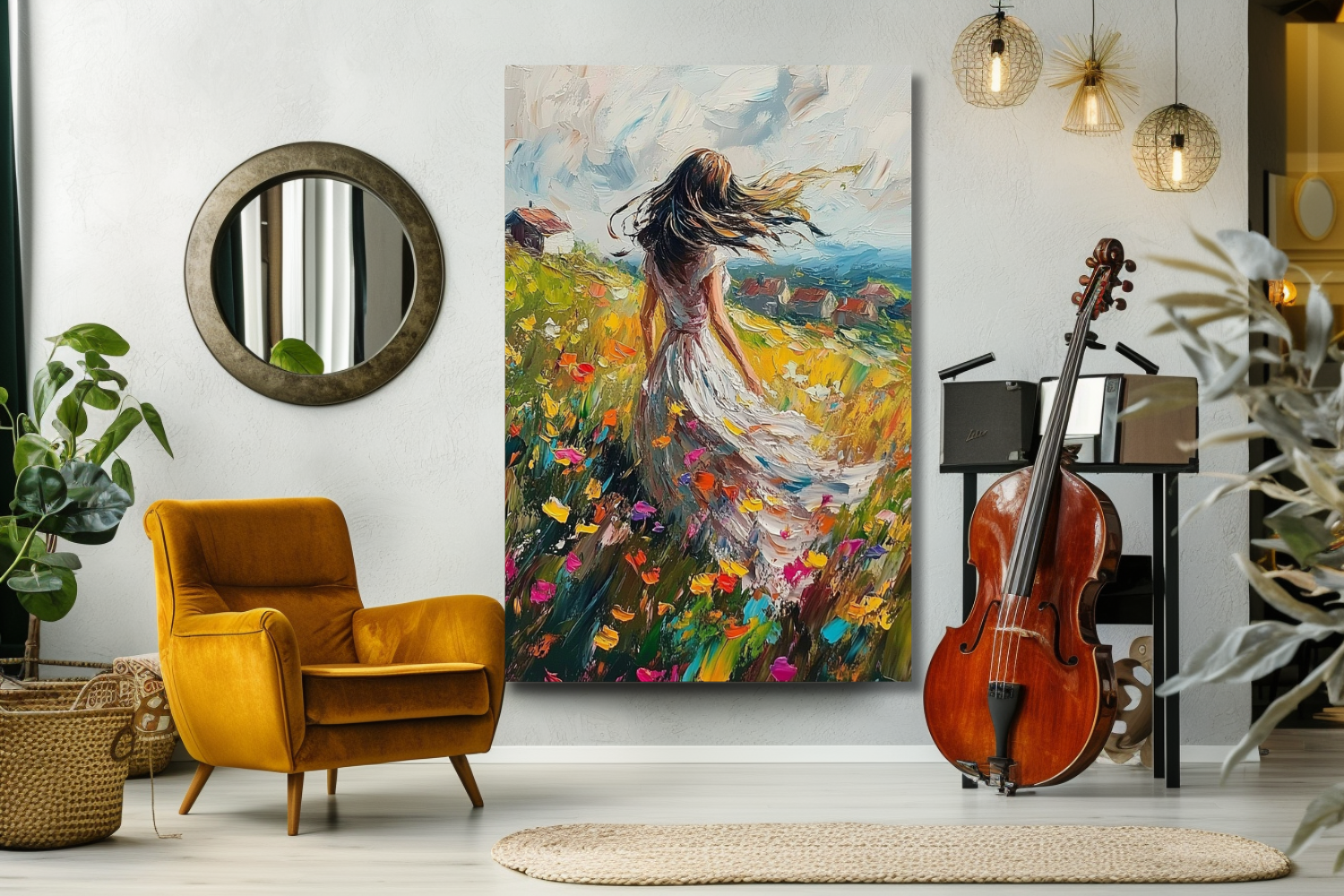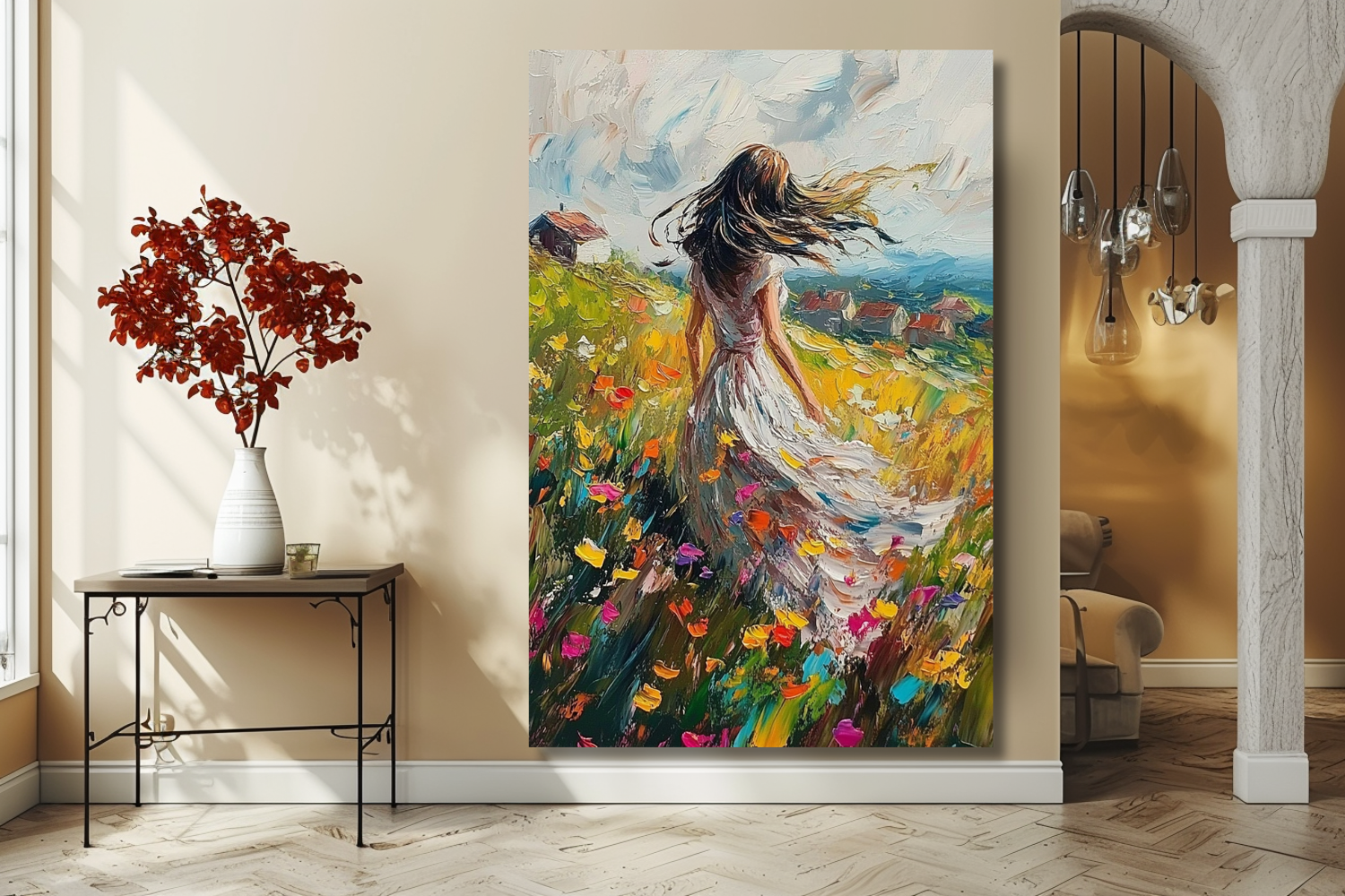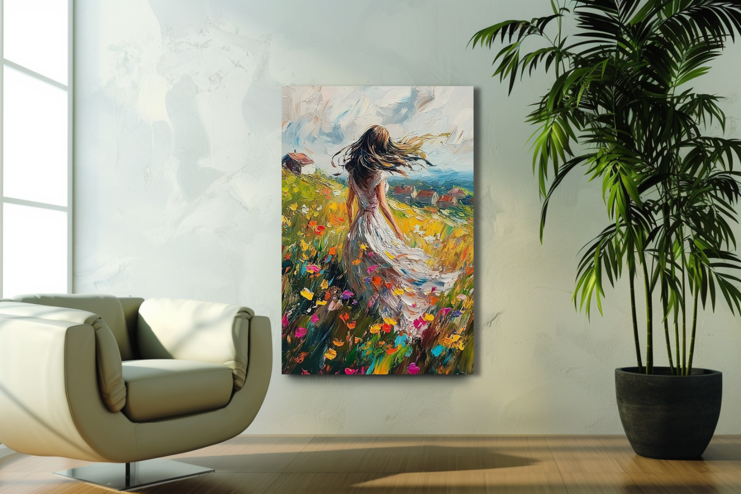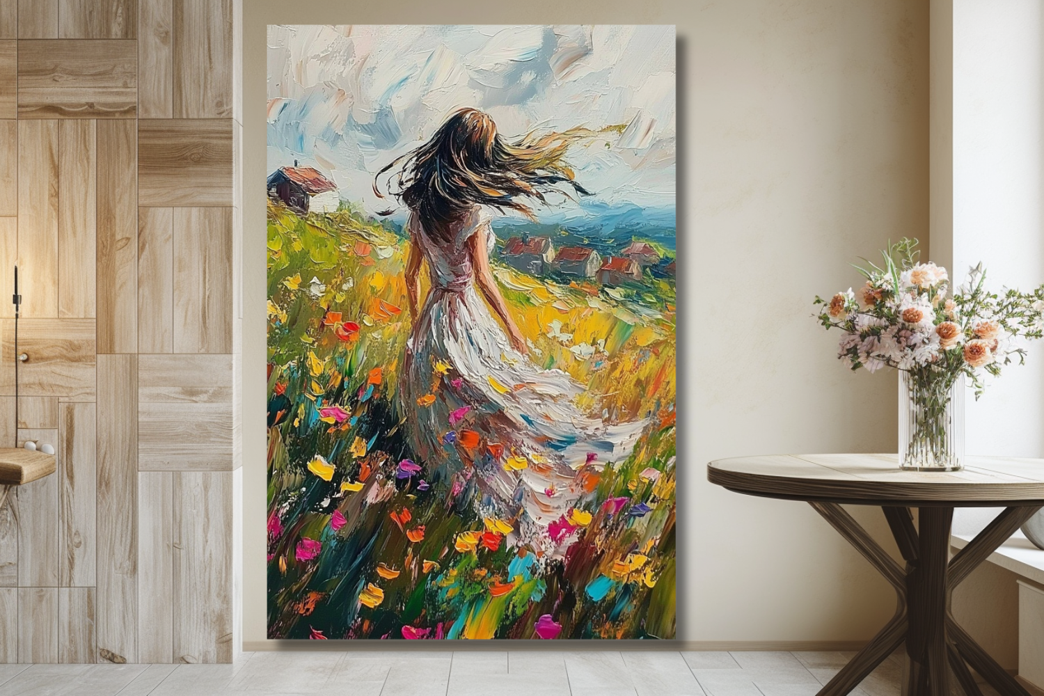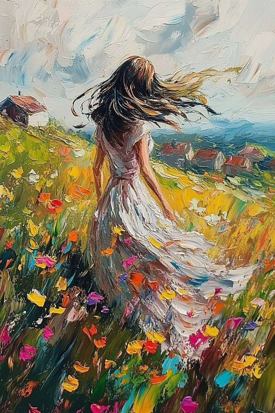 Bright and deep colors—vibrantly blooming flowers, grasses, clouds, and gently blue horizons—all yield to the playful spirit of the wind, creating a sense of warmth and completeness. Every brushstroke, every burst of color enriches this composition, revealing the beauty of nature and the subtle bond between it and humanity. It is a painting that touches the heart and allows one to immerse in that moment of freedom, where we are alone with ourselves and our feelings.